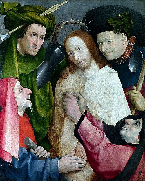 博斯《荆冠加冕》作品介绍:外文名Christ Mocked 或者The Crowning with Thorns;橡木,油彩Oil on oak;纵73.8厘米,横59厘米;作于1490 - 1500 年;藏于英国伦敦市国家画廊 National Gallery, London。
