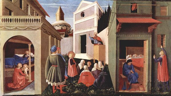 安基利柯《圣尼古拉的故事》作品介绍:外文名 Story of St Nicholas;木板、蛋彩Tempera on wood;纵34厘米,横60厘米;作于 l445 年;藏于意大利梵蒂冈梵蒂冈博物棺(陈列棺) Vatican Museums (Pinacoteca), Vatican City。