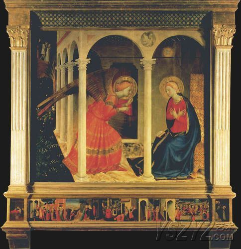 安基利柯《圣告图》作品介绍:外文名The Annunciation;木板、蛋彩Tempera on wood;纵175厘米,横180厘米;作于1430 - 1432 年;藏于意大利科托那耶 博物馆。