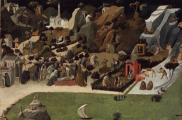 安基利柯《修道者的生活场景》作品介绍:外文名 Scenes from the Lives of the Desert Fathers ( Thebaid );杨木、蛋彩Tempera on poplar;纵73.8厘米,横105厘米;作于1420年;藏于匈牙利布达佩斯市美术馆 Museum of Fine Arts, Budapest ( Szepmuveszeti Muzeum, Budapest ) 。