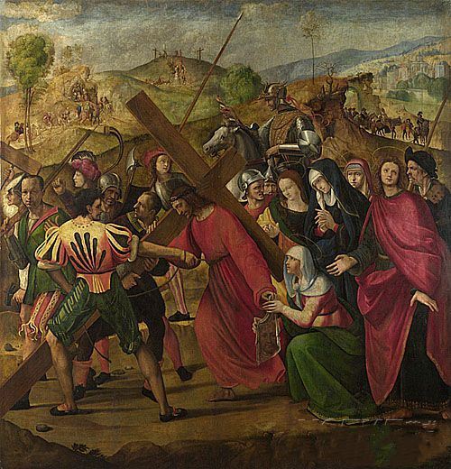 基尔兰达约《向耶 受难地前进的队伍》作品介绍:外文名The Procession to Calvary;画布,油彩oil on canvas;纵166厘米,横161里;作于1505年;藏于英国伦敦国家画廊 National Gallery, London。