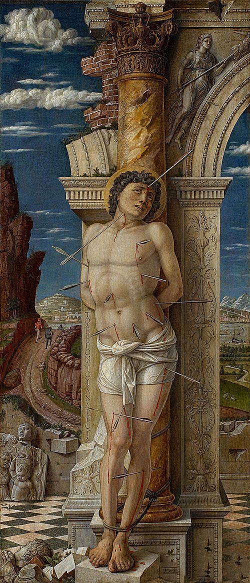 曼特尼亚《圣赛巴斯帝安》作品介绍:外文名St. Sebastian;木板、油彩oil on wood;纵68厘米,横30厘米;作于1457 - 59 年;藏于奥地利维也纳市艺术史博物馆 Kunsthistorisches Museum, Vienna。