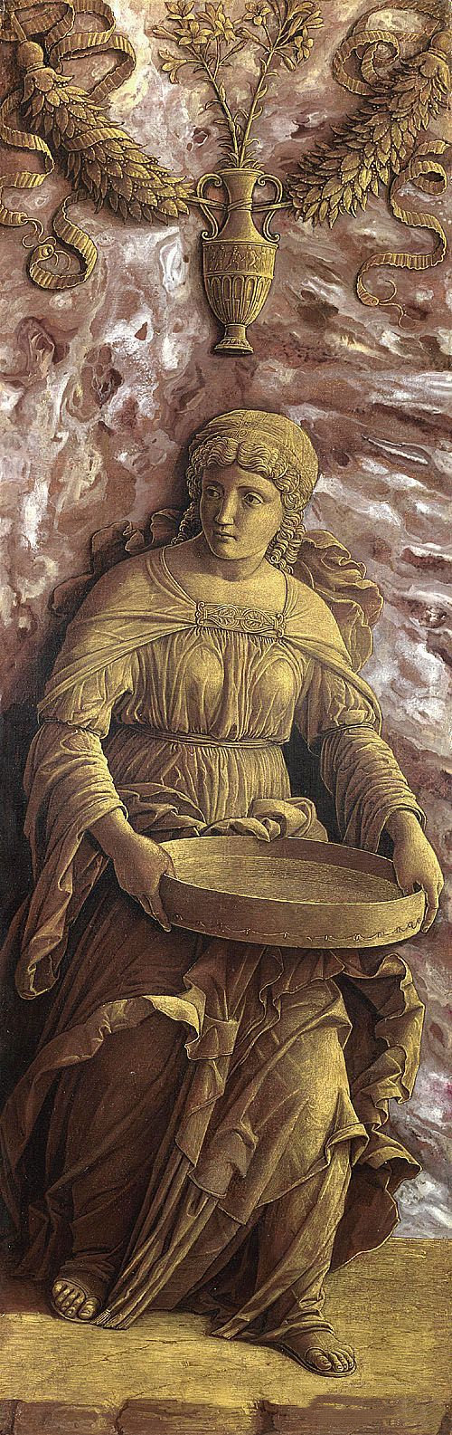 曼特尼亚《带筛子的杜西亚》作品介绍:外文名The Vestal Virgin Tuccia with a Sieve;白杨木、蛋彩egg Tempera on poplar;纵72.5厘米,横23厘米;作于1495 - 1506 年;藏于英国伦敦国家画廊 National Gallery, London。