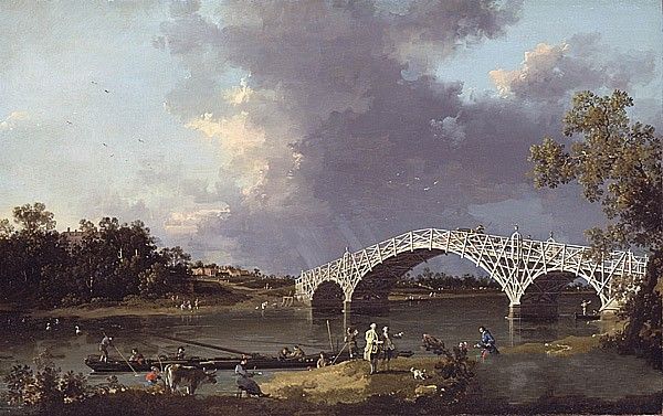 卡纳莱托《沃尔顿桥》作品介绍:外文名A View of Walton Bridge;画布,油彩Oil on canvas;纵48.8厘米,横76.7厘米;作于1754年;藏于私人收藏 private collection。