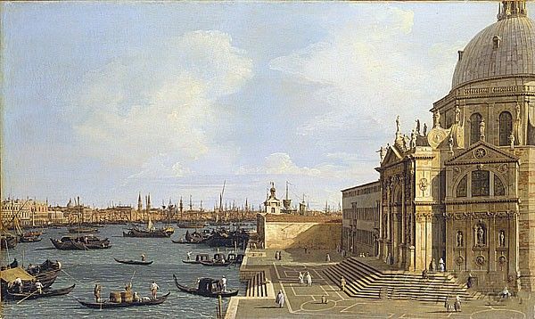 卡纳莱托《威尼斯安康圣母教堂》作品介绍:外文名Venice:Santa Maria della Salute;画布,油彩Oil on canvas;纵47.6厘米,横79.4厘米;作于1740 年;藏于私人收藏 private collection。