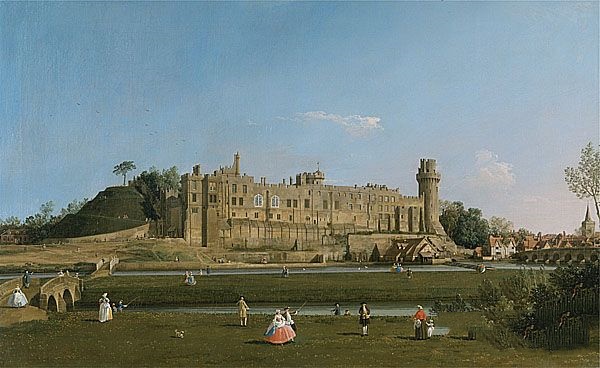 卡纳莱托《瓦立克城堡》作品介绍:外文名Warwick Castle;画布,油彩Oil on canvas;纵95.9厘米,横142.9厘米;作于1748 - 1749 年;藏于美国康州新纽哈芬耶鲁英国艺术中心 Yale Center for British Art, New Haven 。