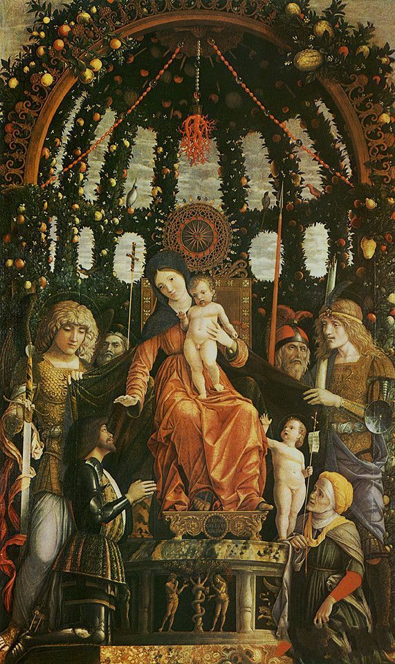 曼特尼亚《圣母荣耀像》作品介绍:外文名St James on the way to his execution;画板、蛋彩Tempera on panel;纵250厘米,横160厘米;作于1496年;藏于法国巴黎市罗浮宫博物馆 Louvre Museum, Paris。
