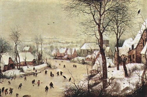 勃鲁盖尔《冬季风光》作品介绍:外文名 Winter Landscape with Skaters and Bird Trap;橡木、油彩oil on oak;纵38厘米,横56厘米;作于1565年;藏于比利时布鲁塞尔皇家艺术博物馆 Musee Royaux des Beaux-Arts, Brussels。