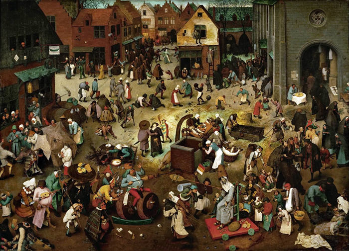 勃鲁盖尔《在节庆间隔期的争斗》:在这件作品中勃鲁盖尔将尼德兰人在一年一度的节日里醉舞狂歌,戏耍作乐的习俗诉诸笔端:大街两旁摆满了帐篷与货摊,一头公牛正被煮熟吃掉。歌舞加上乡村小戏通宵达旦演出,乞丐与仆人也毫无顾忌地化装成国王。浪荡子拥抱着拄着拐棍的跛子们放肆地跳跃……通过喧哗、躁动的构图,画家不无贬意地揭露出当时人文主义者时常痛斥的民间宴庆礼仪之奢靡、炫耀、虚荣与放纵的不良风气。