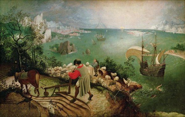 勃鲁盖尔《伊卡洛斯的坠落》作品介绍:外文名Landscape With The Fall Of Icarus;画布、油彩oil on canvas;纵73.5厘米,横112厘米;作于1558年;藏于比利时布鲁塞尔皇家艺术博物馆Musee Royaux des Beaux-Arts,Brussels。