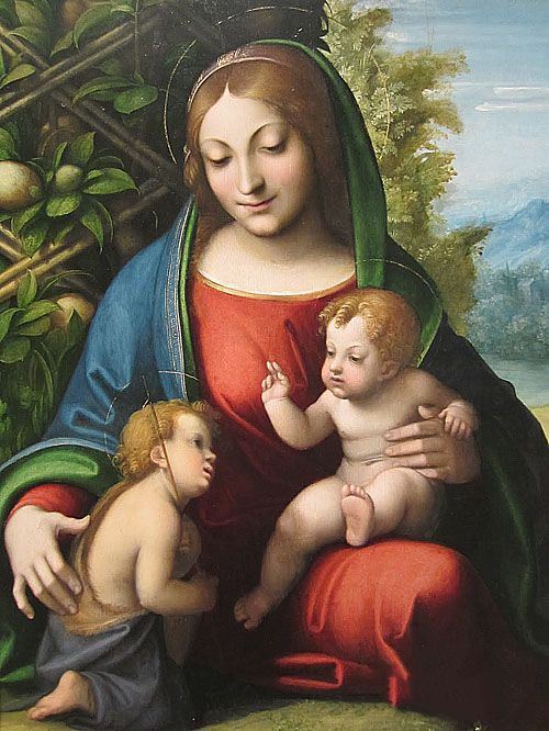柯雷乔《圣母子和施洗约翰》作品介绍:外文名Virgin and Child with the Young Saint John the Baptist;画板,油彩oil on panel;纵64.2厘米,横50.2厘米;作于1515年;藏于美国伊利诺州芝加哥艺术机构 The Art Institute of Chicago。