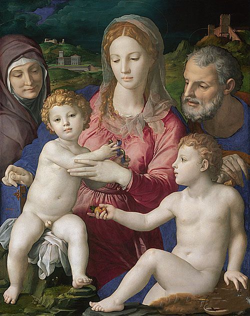 布隆基诺《圣家庭与圣施洗约翰》作品介绍:外文名Holy Family with St. Anne and the Infant St. John;画板,油彩oil on panel;纵126.8厘米,横101.5厘米;作于1545 - 1546 年;藏于奥地利维也纳艺术史博物馆 Kunsthistorisches Museum, Vienna。