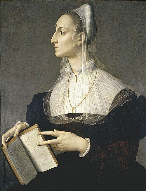 布隆基诺《劳拉.巴蒂费里肖像》作品介绍:外文名Portrait of Laura Battiferri;画板,油彩oil on panel;纵83厘米,横60厘米;作于1550 -1555 年;藏于意大利佛罗伦萨维奇奥宫 Palazzo Vecchio, Firenze。