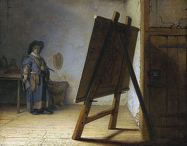 伦勃朗《画室》作品介绍:外文名Artist in his Studio;画板,油彩oil on panel;纵24.8厘米,横31.7厘米;作于1629年;藏于美国麻州波士顿美术馆 Museum of Fine Arts, Boston。