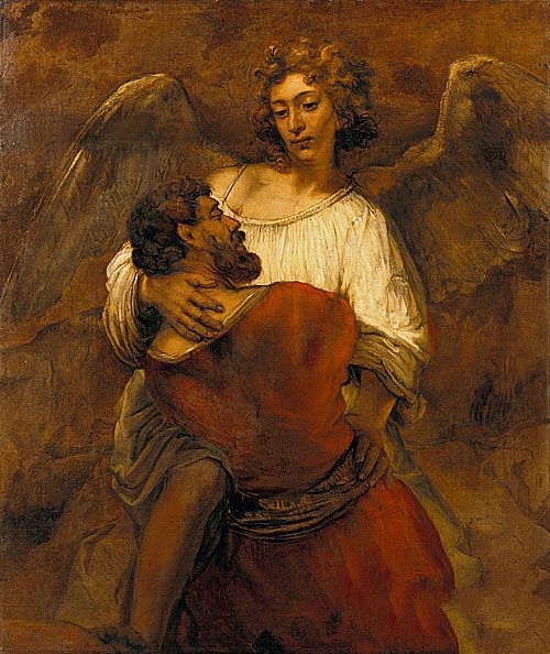 伦勃朗《雅克与天使在搏斗》作品介绍:外文名 Jacob Wrestling with the Angel;画布,油彩oil on canvas;纵137厘米,横116厘米;作于1659 年;藏于德国柏林国立博物馆绘画陈列室 Gemaldegalerie, Staatliche Museen, Berlin。