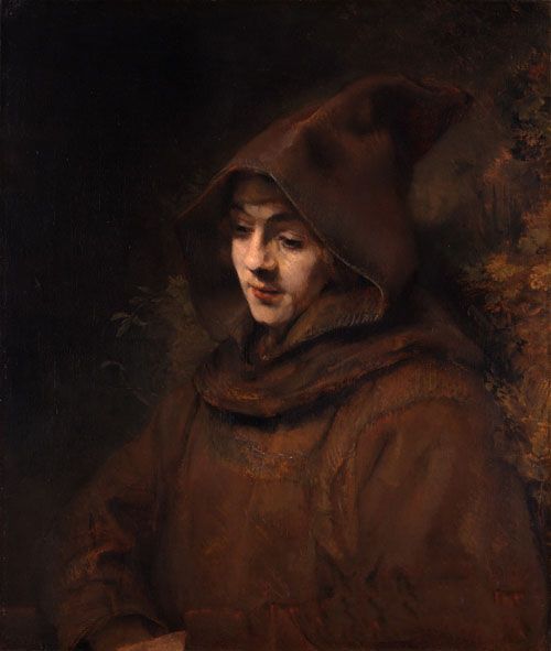 伦勃朗《穿修士服的艺术家儿子》作品介绍:外文名 Titus van Rijn in a Monk ’s Habit;画布,油彩oil on canvas;纵79.5厘米,横67.5厘米;作于1660年;藏于荷兰阿姆斯特丹国立博物馆 Rijksmuseum, Amsterdam。