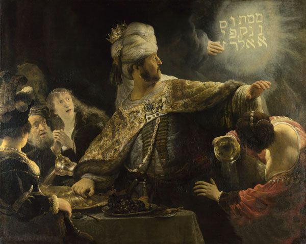 伦勃朗《伯沙撒的盛宴》作品介绍:外文名Belshazzar ’s Feast;画布,油彩oil on canvas;纵167.6厘米,横209.2厘米;作于1635年;藏于英国伦敦国家画廊 National Gallery, London。