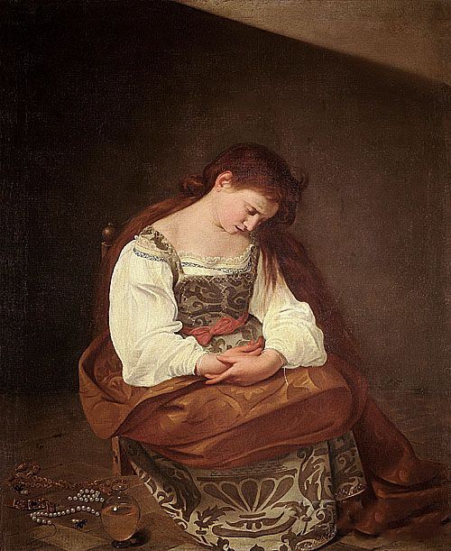 卡拉瓦乔《玛达莱娜的忏悔》作品介绍:外文名Penitent Magdalene;画布,油彩oil on canvas;纵122.5厘米,横98.5厘米;作于1594 - 1596 年;藏于意大利罗马多利亚‧庞菲利画廊 Galleria Doria Pamphilj, Rome。