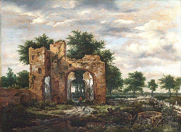 雷斯达尔《城堡遗迹》作品介绍:外文名A Ruined Castle Gateway;木板,油彩oil on wood;纵46.7厘米,横60.5厘米;作于1650 - 1652 年;藏于英国伦敦国家画廊 National Gallery, London。