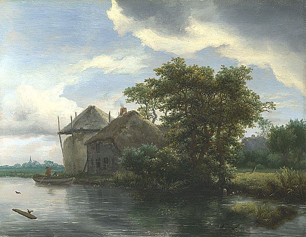 雷斯达尔《河畔小屋》作品介绍:外文名A Cottage and a Hayrick by a River;橡木,油彩oil on oak;纵26厘米,横33.4厘米;作于1646 - 1650 年;藏于英国伦敦国家画廊 National Gallery, London。