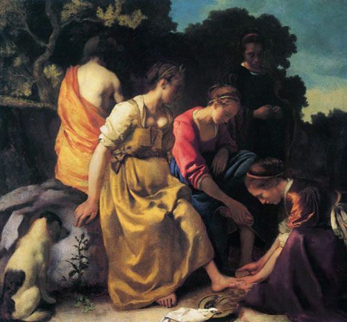 维米尔《月神及女神们》作品介绍:外文名Diana and her nymphs;画布,油彩oil on canvas;纵63.5厘米,横57.8厘米;作于1655 - 1656 年;藏于荷兰海牙莫瑞修斯皇家博物馆 Mauritshuis Royal Picture Gallery, The Hague。