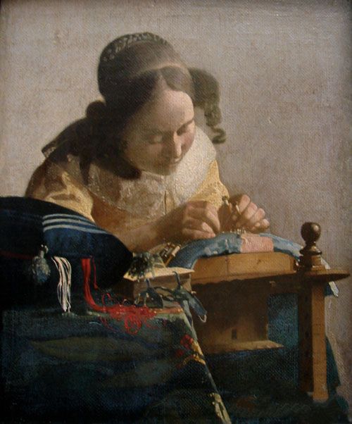 维米尔《制鞋带工人》作品介绍:外文名The Lacemaker;木板,油彩oil on wood;纵21厘米,横24厘米;作于1669 - 70 年;藏于法国巴黎罗浮宫 Musee du Louvre, Paris。