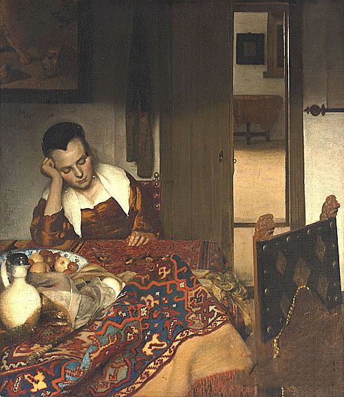 维米尔《睡着的女仆》作品介绍:外文名A Maid Asleep;画布,油彩oil on canvas;纵87.6厘米,横76.5厘米;作于1656 - 1657 年;藏于美国纽约大都会美术馆 Metropolitan Museum of Art, New York。