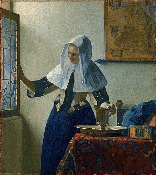 维米尔《拿水壶的年轻女子》作品介绍:外文名Young Woman with a Water Pitcher;画布,油彩oil on canvas;纵45.7厘米,横40.6厘米;作于1660 - 1667 年;藏于美国纽约大都会美术馆 Metropolitan Museum of Art, New York。