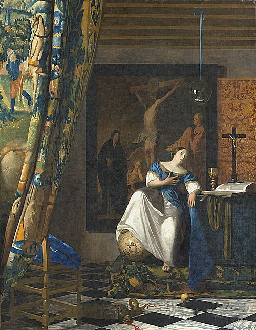 维米尔《信仰的寓言》作品介绍:外文名 Allegory of the Faith;画布,油彩oil on canvas;纵114.3厘米,横88.9厘米;作于 1670 年;藏于美国纽约大都会美术馆 Metropolitan Museum of Art, New York。
