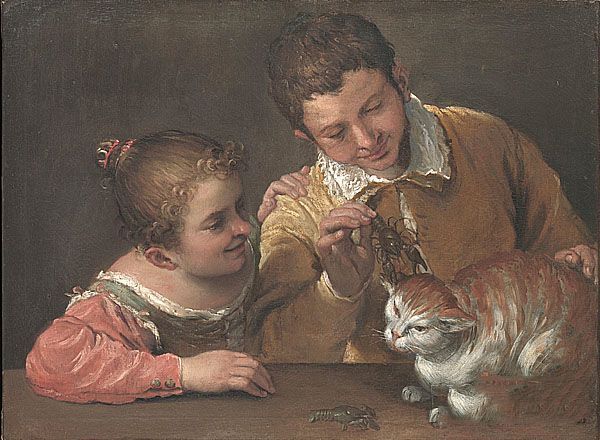 卡拉齐《逗一 猫的两个孩子》作品介绍:外文名Two Children Teasing a Cat;画布,油彩Oil on canvas;纵66厘米,横88.9厘米;作于不详;藏于美国纽约大都会美术馆 Metropolitan Museum of Art, New York。