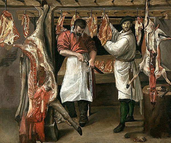 卡拉齐《肉贩店》作品介绍:外文名The Butcher ’s Shop;画布,油彩Oil on canvas;纵59.7厘米,横71厘米;作于1580年;藏于美国德州华兹堡金柏莉美术馆 Kimbell Art Museum, Fort Worth, Texas。