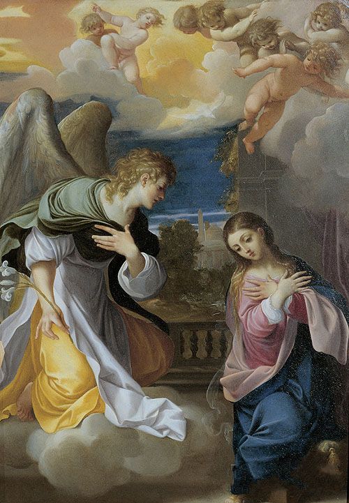 卡拉齐《报佳音》作品介绍:外文名Annunciation;画布,油彩Oil on canvas;纵54厘米,横41厘米;作于1603 - 1604 年;藏于私人收藏 private collection。