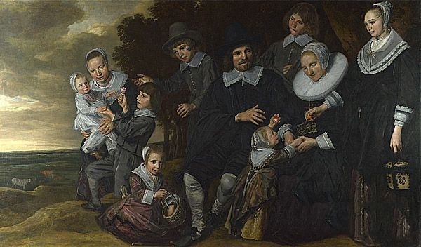 哈尔斯《在郊外的家族成员》作品介绍:外文名A Family Group in a Landscape;画布,油彩Oil on canvas;纵148.5厘米,横251厘米;作于1647 - 1650 年;藏于英国伦敦国家画廊 National Gallery, London。