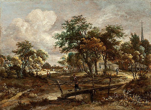 霍贝玛《小桥景观》作品介绍:外文名Landscape with a Footbridge;画布,油彩oil on canvas;纵24.8厘米,横32.1厘米;作于1664 - 1665年;藏于美国加州洛杉 郡立美术馆 Los Angeles County Museum of Art