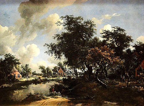 霍贝玛作品介绍:全名梅因德尔特·霍贝玛,外文名Meindert Hobbema, 生于1638年,卒于1709年。荷兰著名画家。他早年从师J.van雷斯达尔学画风景画。作品多描绘乡村道路、农舍、池畔等,代表作《林荫道》、《磨坊》等,真实地表现了自然界多变的景象,其精确的透视为人称道。