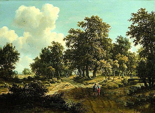 霍贝玛《郊区的树林》作品介绍:外文名The Outskirts of a Wood;橡木,油彩oil on oak;纵52.5厘米,横68.2厘米;作于1660 年;藏于英国伦敦华莱士收藏馆 The Wallace Collection, London