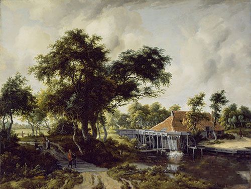 霍贝玛《磨坊》作品介绍:外文名A Watermill;橡木,油彩oil on oak;纵69厘米,横92厘米;作于1662 - 1664年;藏于英国伦敦华莱士收藏馆 The Wallace Collection, London43