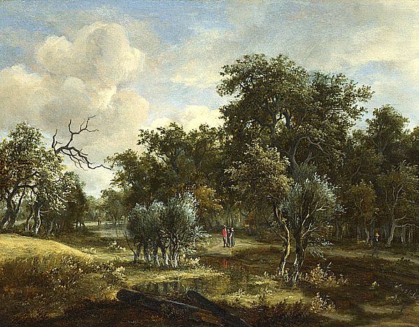 霍贝玛《树林边的小溪流》作品介绍:外文名 A Stream by a Wood;橡木,油彩oil on oak;纵31.4厘米,横40.1厘米;作于1663 年;藏于英国伦敦国家画廊 National Gallery, London