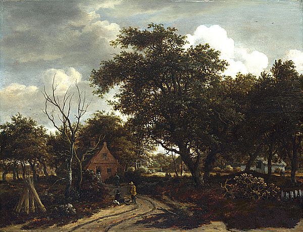 霍贝玛《树林中的农舍》作品介绍:外文名 Cottages in a Wood;木板,油彩oil on wood;纵52.1厘米,横68厘米;作于1660 年;藏于英国伦敦国家画廊 National Gallery, London