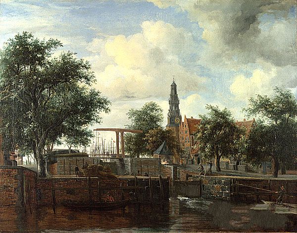 霍贝玛《阿姆斯特丹的哈伦关卡》作品介绍:外文名The Haarlem Lock, Amsterdam;画布,油彩oil on canvas;纵77厘米,横98厘米;作于1663 - 1665 年;藏于英国伦敦国家画廊 National Gallery, London