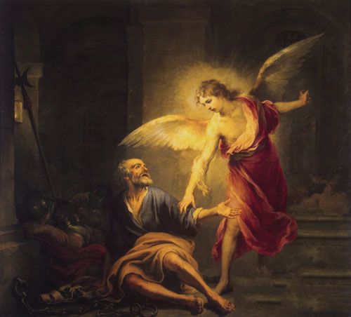 穆里罗《解放圣彼得》作品介绍:外文名The Liberation of St Peter;画布,油彩Oil on canvas;纵238厘米,横260厘米;作于1665 - 1667 年;藏于俄罗斯圣彼得堡艾米塔吉博物馆 State Hermitage Museum, St. Petersburg。