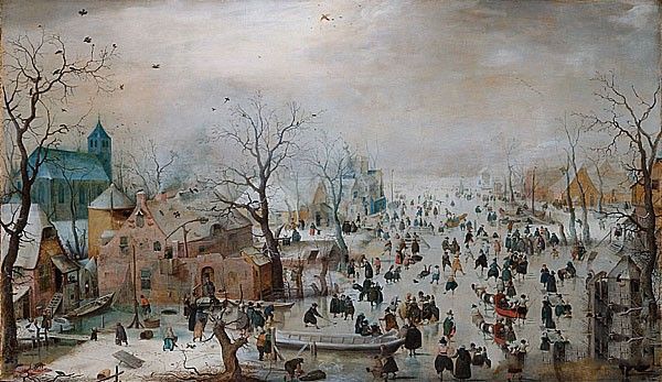 阿维坎普《有溜冰者的冬天风景》作品介绍:外文名Winter landscape with skaters;画板,油彩Oil on panel;纵77.3厘米,横131.9厘米;作于1608年;藏于荷兰阿姆斯特丹国立博物馆 Rijksmuseum, Amsterdam。