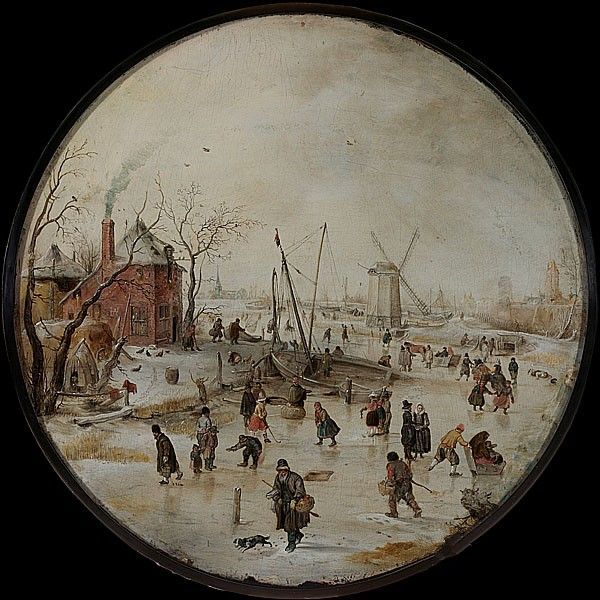 阿维坎普《冰河上溜冰》作品介绍:外文名Frozen River with Skaters;橡木,油彩Oil on oak;纵30.5厘米,横30.5厘米;作于1620年;藏于匈牙利布达佩斯市美术馆 Museum of Fine Arts, Budapest ( Szepmuveszeti Muzeum, Budapest )。
