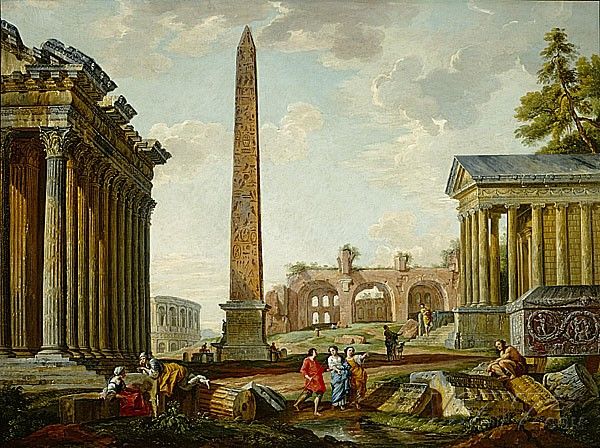 帕尼尼作品介绍:全名乔瓦尼·保罗·帕尼尼,外文名Giovanni Paolo Panini,生于1692年,出17651年.他是18世纪第一位也是最重要的罗马历史风景画家。他对古罗马废墟的描绘,既有精密的观察又有亲切的怀旧,更具有一种史诗般的英雄气概。他喜欢将古罗马建筑的精粹集合在同一画面中,表现出一种华丽、壮观而又荒凉的震撼力。