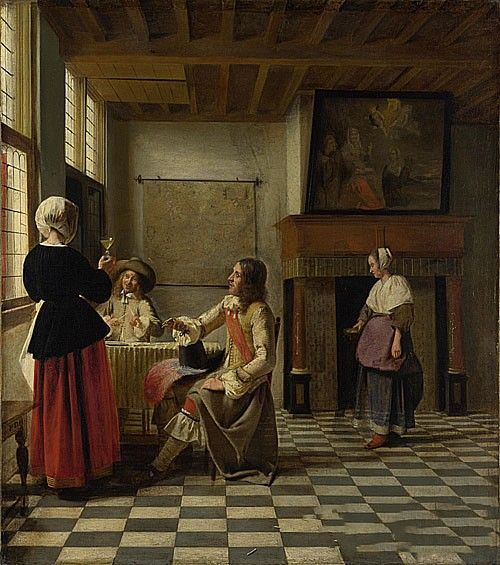 霍赫《品酒的女人》:此作亦译《和两个男人喝酒的女人》,是霍赫优秀的作品之一。作品画面让人感到充满阳光和清新的空气的舒适。画家在作品中塑造了自己的形象,品酒的是自己的妻子安妮特,坐在桌子里面的可能是维米尔,地面处理则是维米尔式的具有强烈空间感的方格地砖。