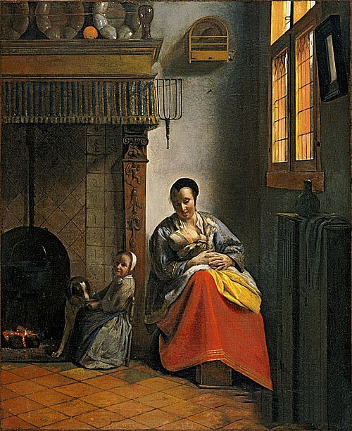 霍赫《室内的女人和小孩》作品介绍:外文名Woman with Children in an Interior;画布,油彩oil on canvas;纵67.6厘米,横55厘米;作于1658 - 1660年;藏于私人收藏 private collection。