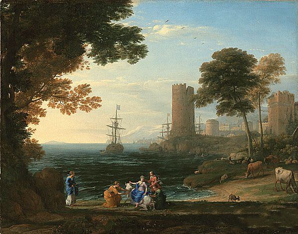 洛兰作品介绍:全名克劳德·洛兰,外文名Claude Lorrain,生于1600年,卒于1682年,法国著名风景画画家。他出生于法国东北部农村,曾做过食品工人,但其一生大部分时间也在意大利度过,克劳德·洛兰终生醉心于海景和意大利风景,克劳德·洛兰对罗马那些有古代遗迹的景色进行过大量的研究的描绘。普桑在风景画中追求哲理性,而洛兰却追求的是抒情的气氛。普桑作品中更多的是清晰、明朗和宁静,洛兰作品却常常显露出雾气迷蒙,光色炫目的效果。他的风景画是理想与梦幻的世界,是一种人为美化的景色,它唤起人们向往美好的情感。后来欧洲人常常以洛兰描绘的理想化风景为标准,寻找或布置洛兰式的风景园林。