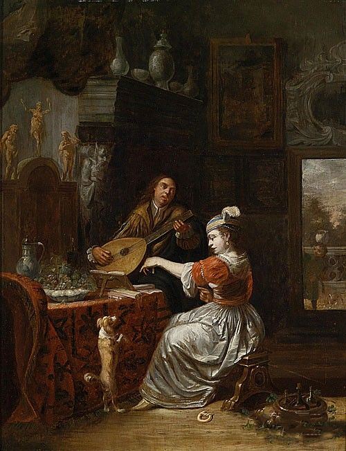 梅 《爱之颂》作品介绍:外文名Die musikalische Liebeserklärung;木板,油彩oil on wood;纵53厘米,横41厘米;作于1662年;藏于私人收藏 private collection。