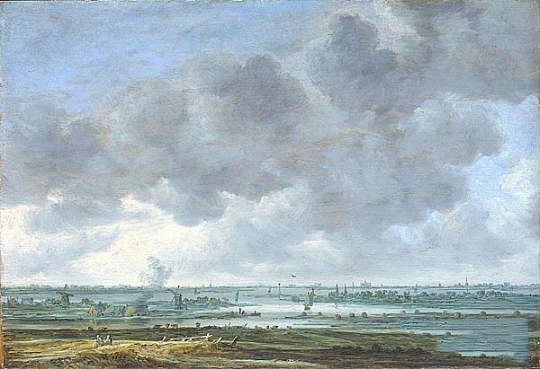 霍延《哈勒姆与哈伦梅尔景观》作品介绍:外文名View of Haarlem and the Haarlemmer Meer;木板,油彩Oil on wood;纵34.6厘米,横50.5厘米;作于1646年;藏于美国纽约大都会美术馆 Metropolitan Museum of Art, New York。