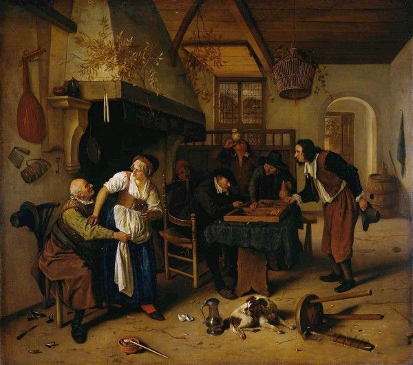 扬·斯丁《酒馆》:扬·斯丁开了一个小酒馆,他很喜欢这个副业,因为经营的酒店给了他一个观察人们喝酒狂欢的机会,给他带来无尽的创作灵感。描绘酒馆里面情景的题材是他最喜欢的题材之一,几乎伴随了他一生的艺术生涯。此作描绘的便是酒馆内的场景。